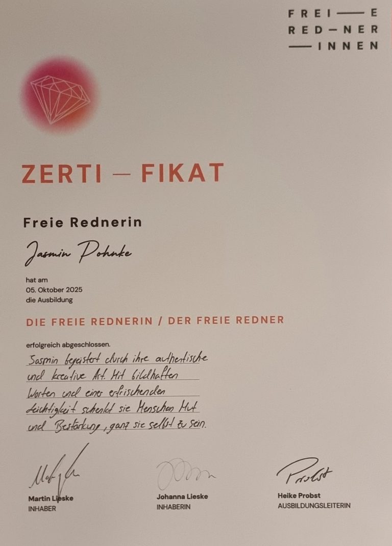 Ich bin Jasmin Pohnke, eure Freie Rednerin und ihr lernt mich so kennen, wie ich bin.